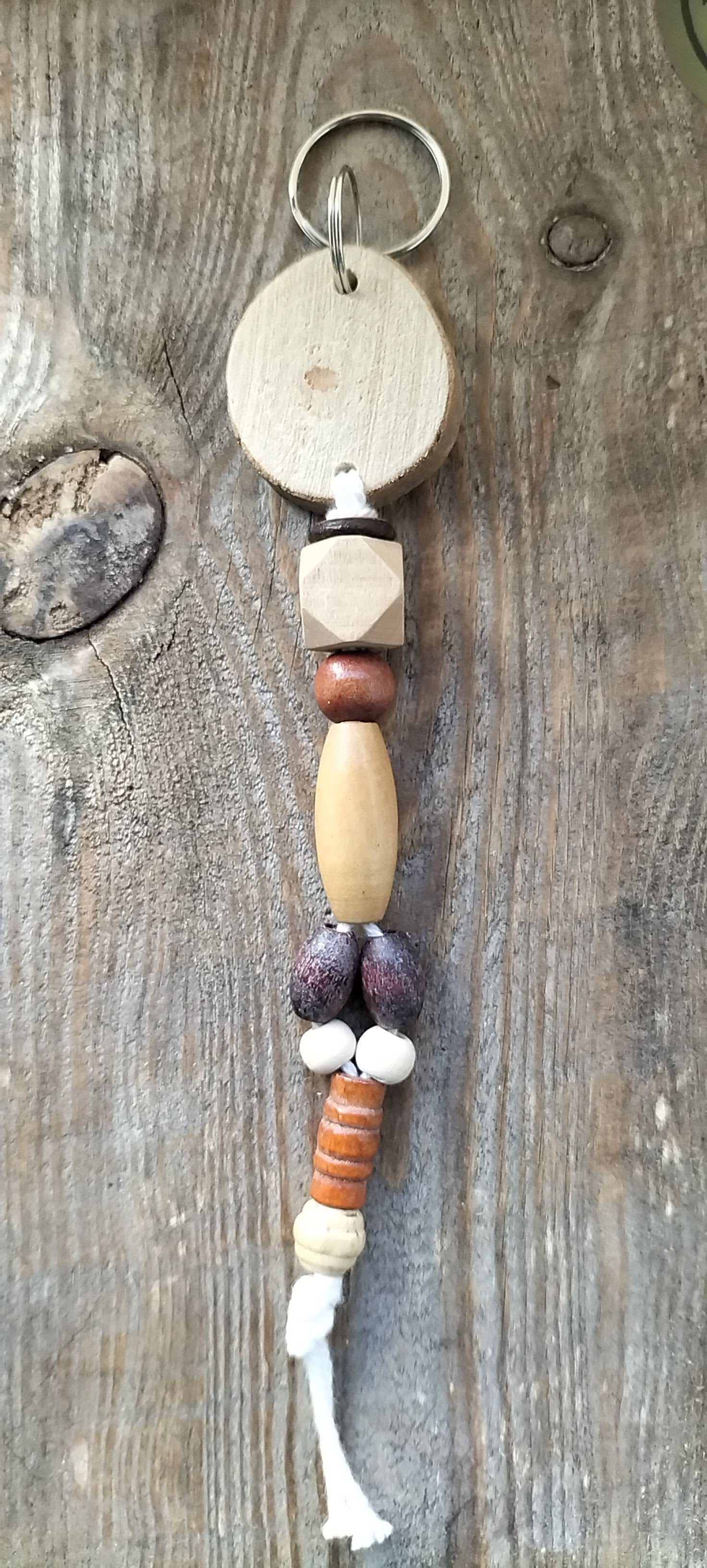 Sleutel/tashanger voorzien van kralen, houten schijf en touw.