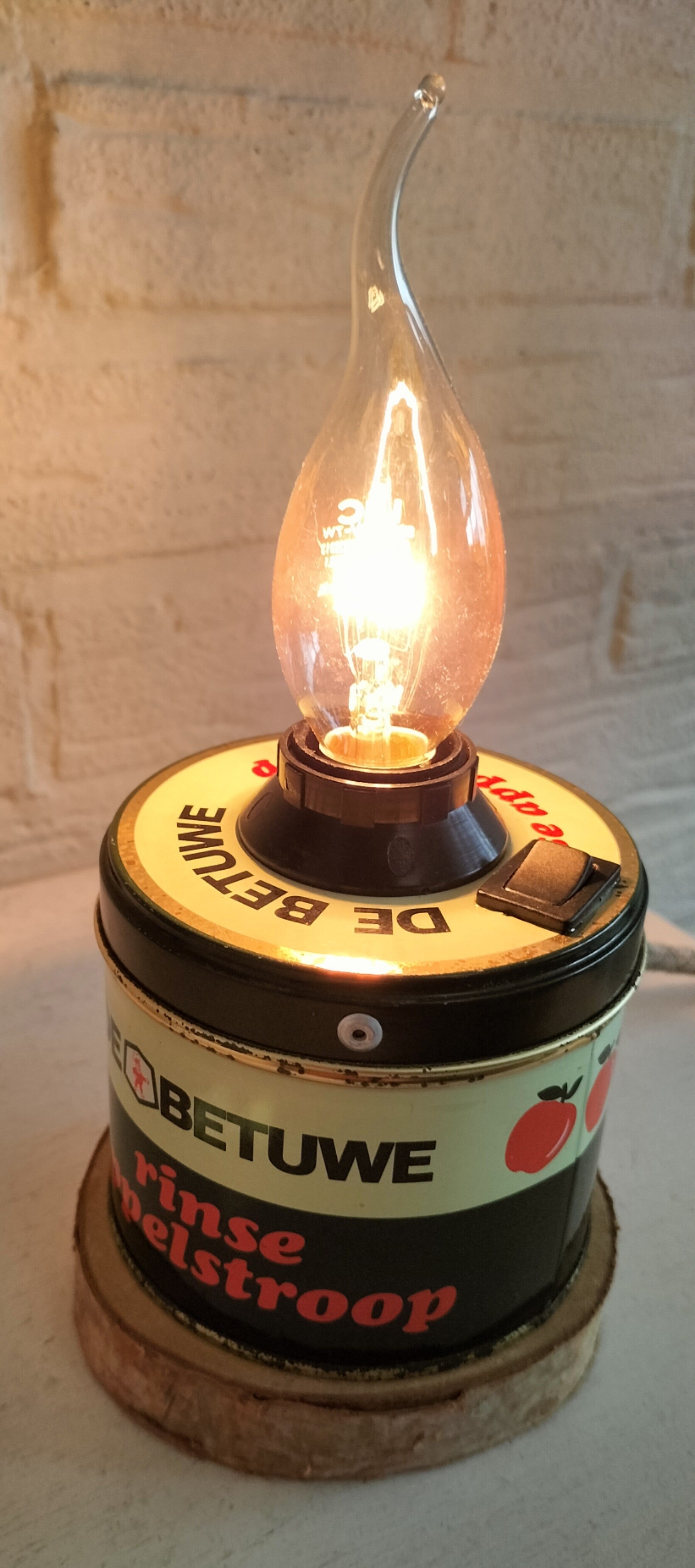 Een klein lampje gemaakt van een oud Rinse appelstroopblik, boomschijf, textiel stroomsnoer.