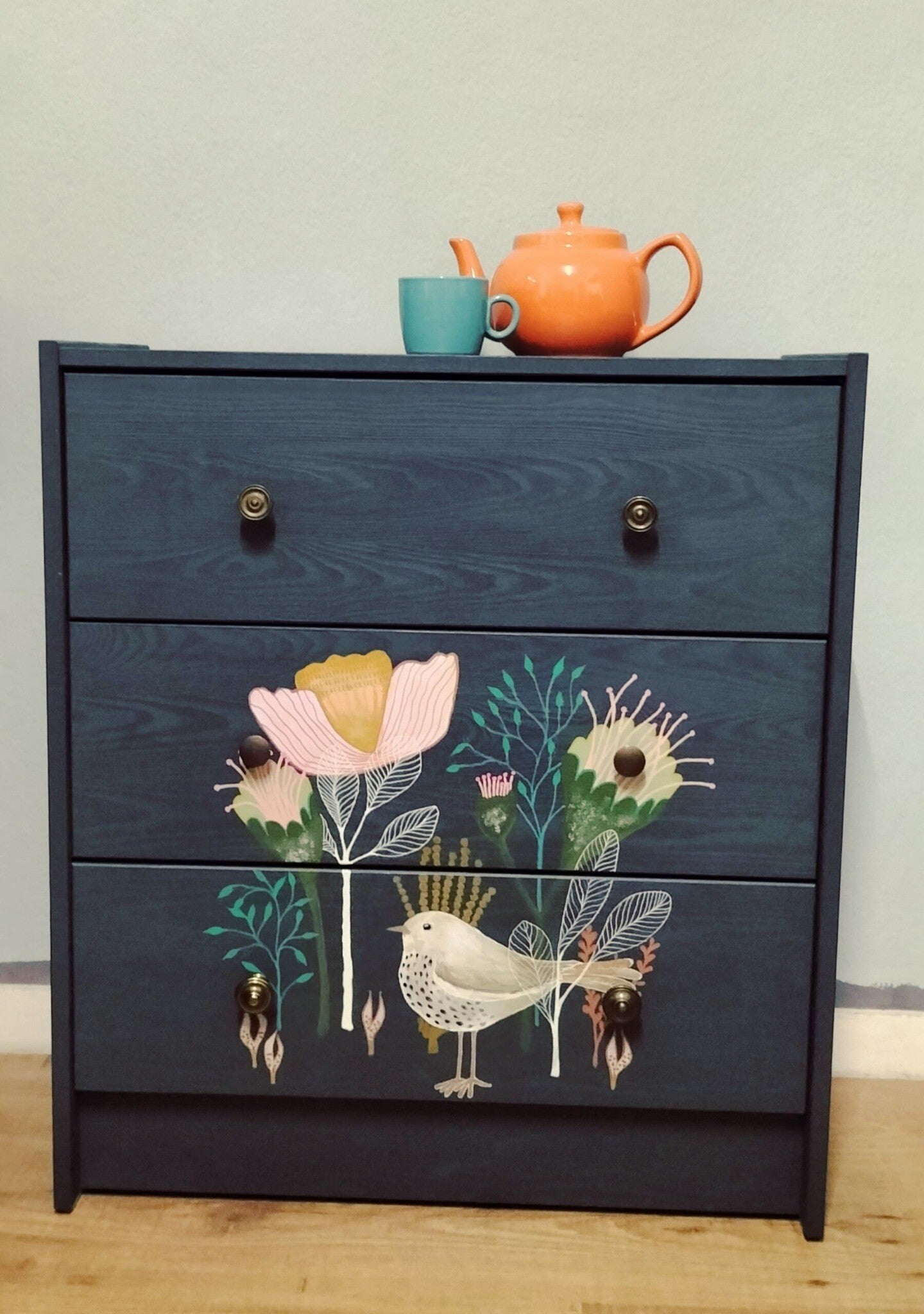 Een oud ladenkastje in een fleurig beschilderd jasje.