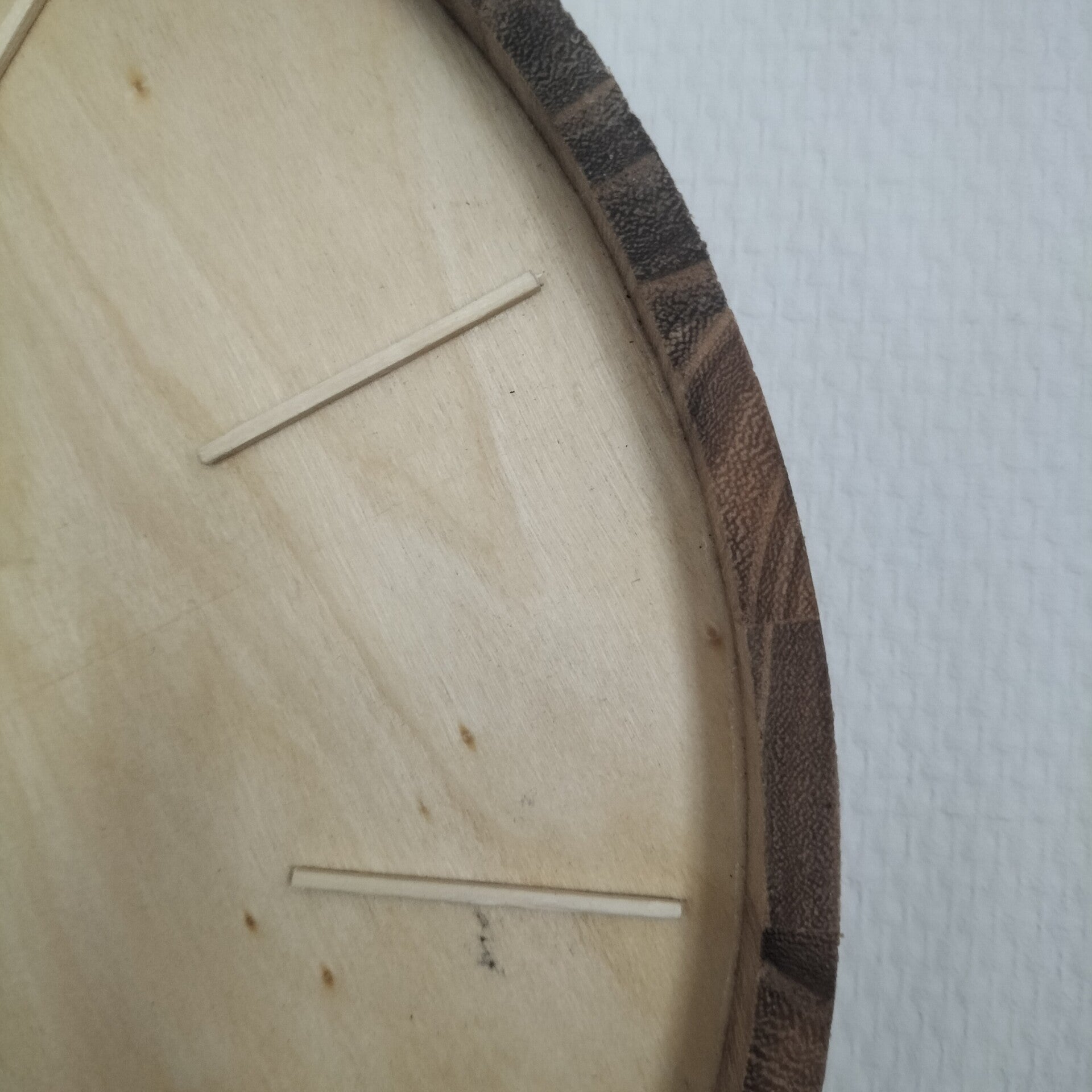 Een oud dienblad omgetoverd tot wandklok. Tijdsaanduiding door lucifersstokjes.. Grootte 35cm.