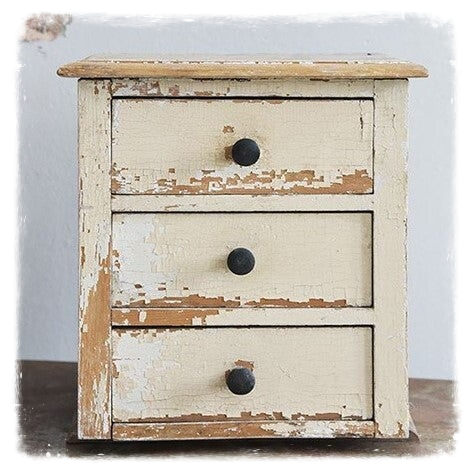Een oud ladenkastje in een fleurig beschilderd jasje.