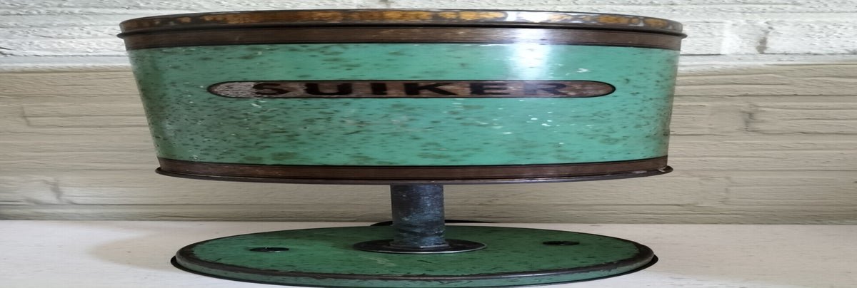 Deze 2 prachtige handgemaakte vintage suiker & koffie bliklampen zijn als set te koop.