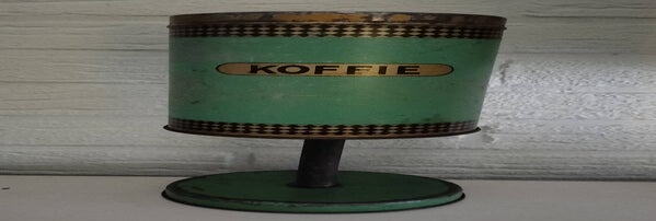 Groot Douwe Egberts koffie voorraadblik getekend door tijd, omgetoverd tot een hanglamp met verstelbaar ecru textielsnoer en zwart metalen plafondkap.